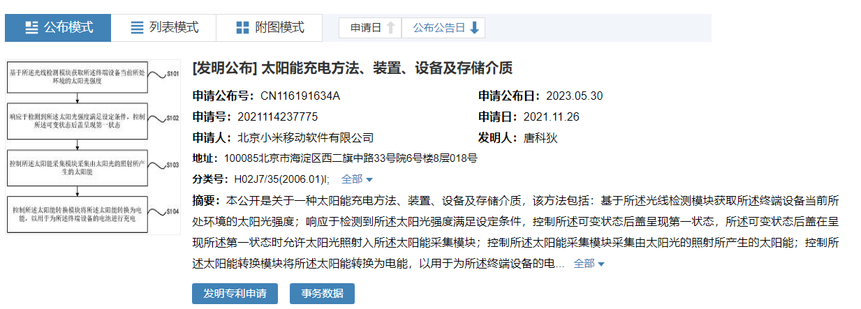 Beijing Xiaomi Mobile Software Co., Ltd. has recently applied for a patent titled “Solar Charging Method, Device, Equipment, and Storage Medium” and its application publication number is CN116191634A. This patent announcement by Xiaomi introduces a groundbreaking solar charging method that can be employed in various terminal equipment, marking a significant advancement in the field of renewable energy technology.