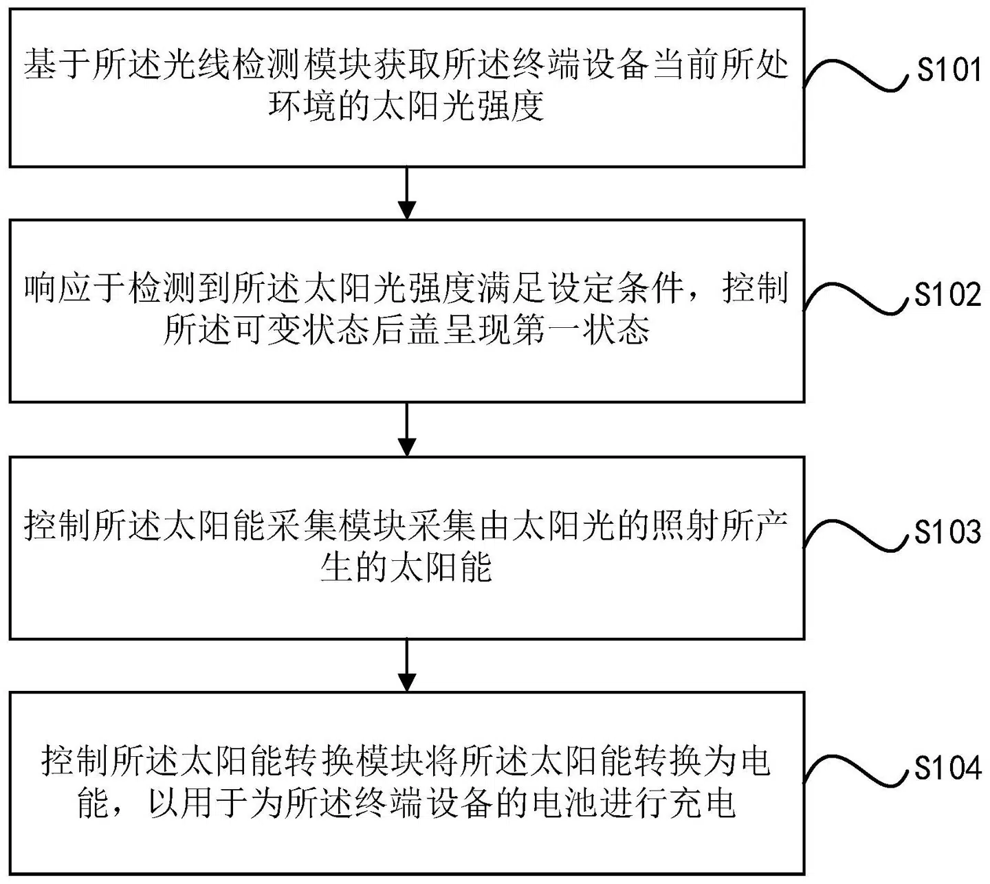 The abstract provided in the patent highlights the core aspects of this innovative solar charging method. It begins with the process of acquiring the sunlight intensity in the immediate environment where the terminal device is located. This is achieved through the utilization of a sophisticated light detection module. Once the intensity of sunlight meets the predetermined conditions, the patent outlines the control mechanism for the variable state rear cover. In response to these conditions, the rear cover is regulated to assume the first state, which allows sunlight to penetrate and illuminate the solar energy collection module. This module plays a crucial role in capturing and harnessing the solar energy generated by the sunlight irradiation.