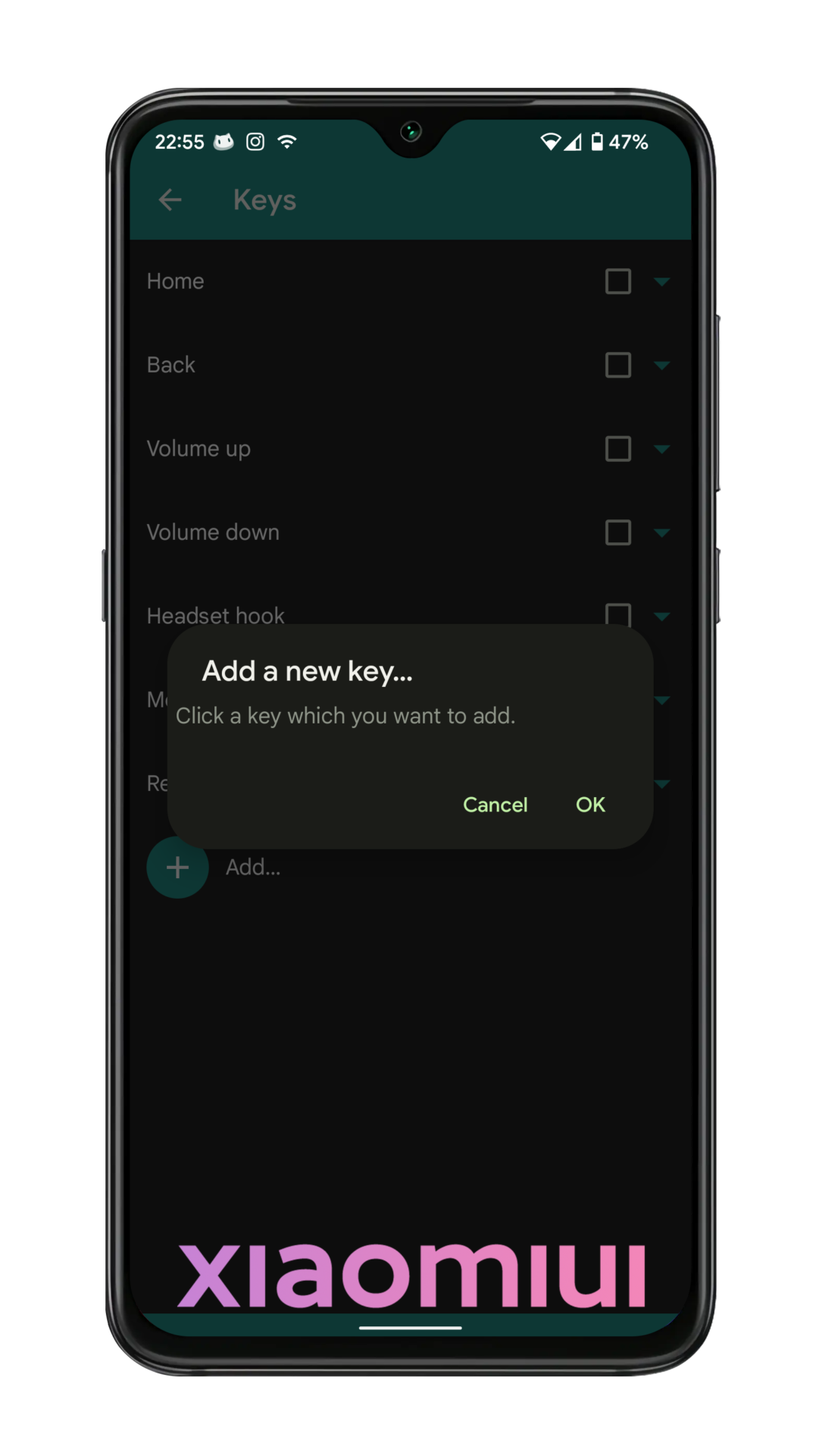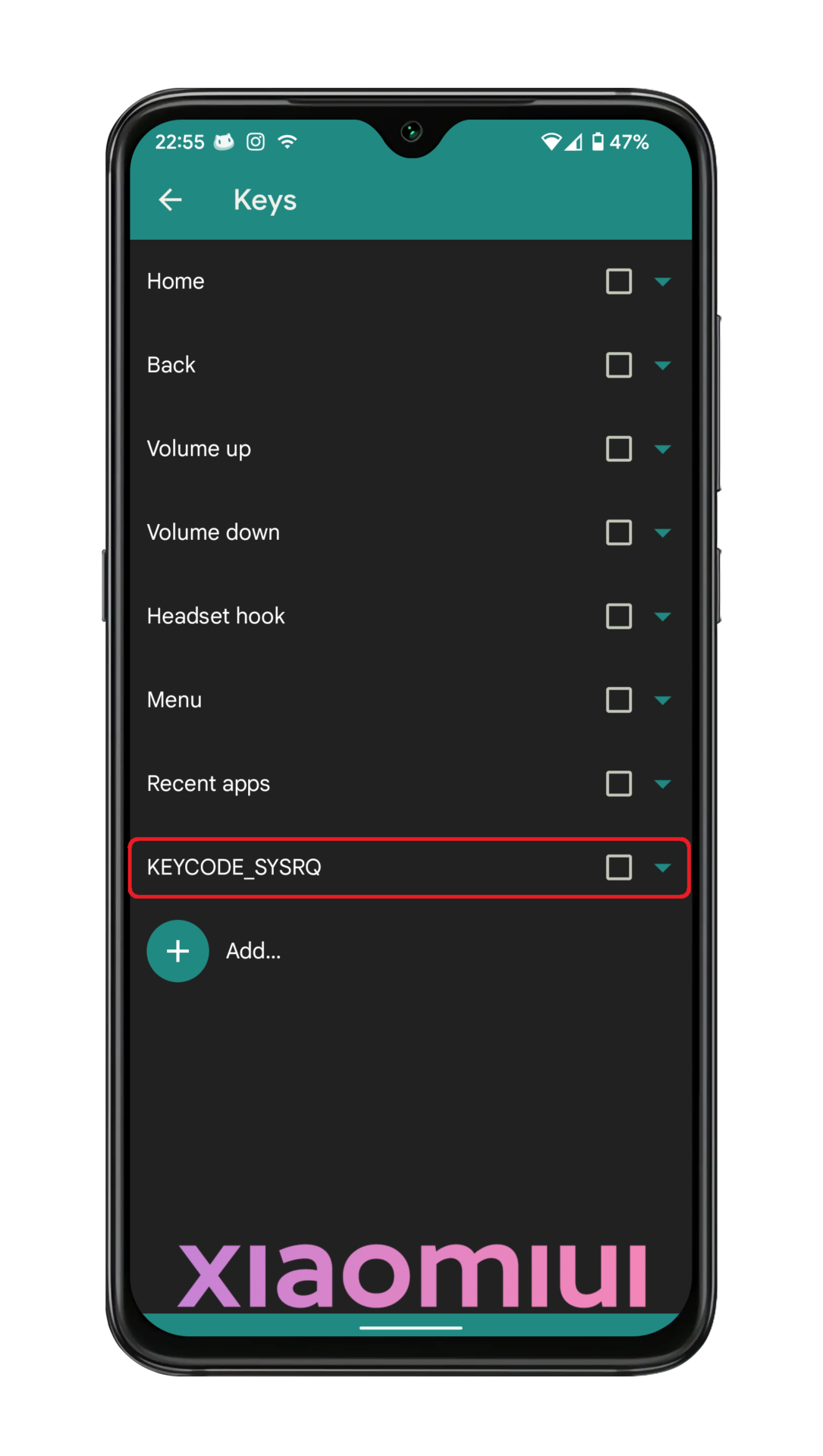 Then click “Add…” button for adding AI button. you will see “click a key which you want to add” text. After that, press AI button.