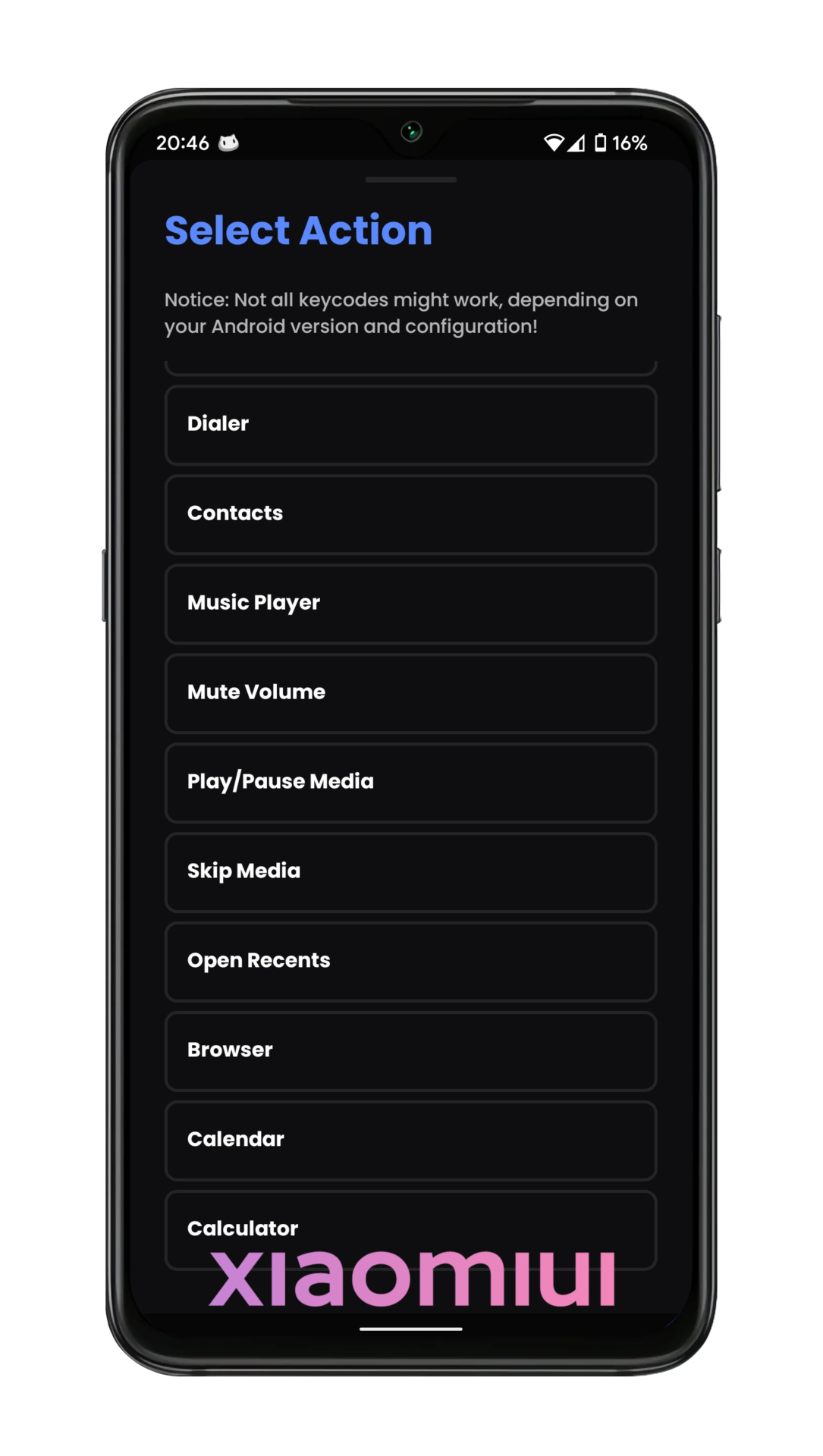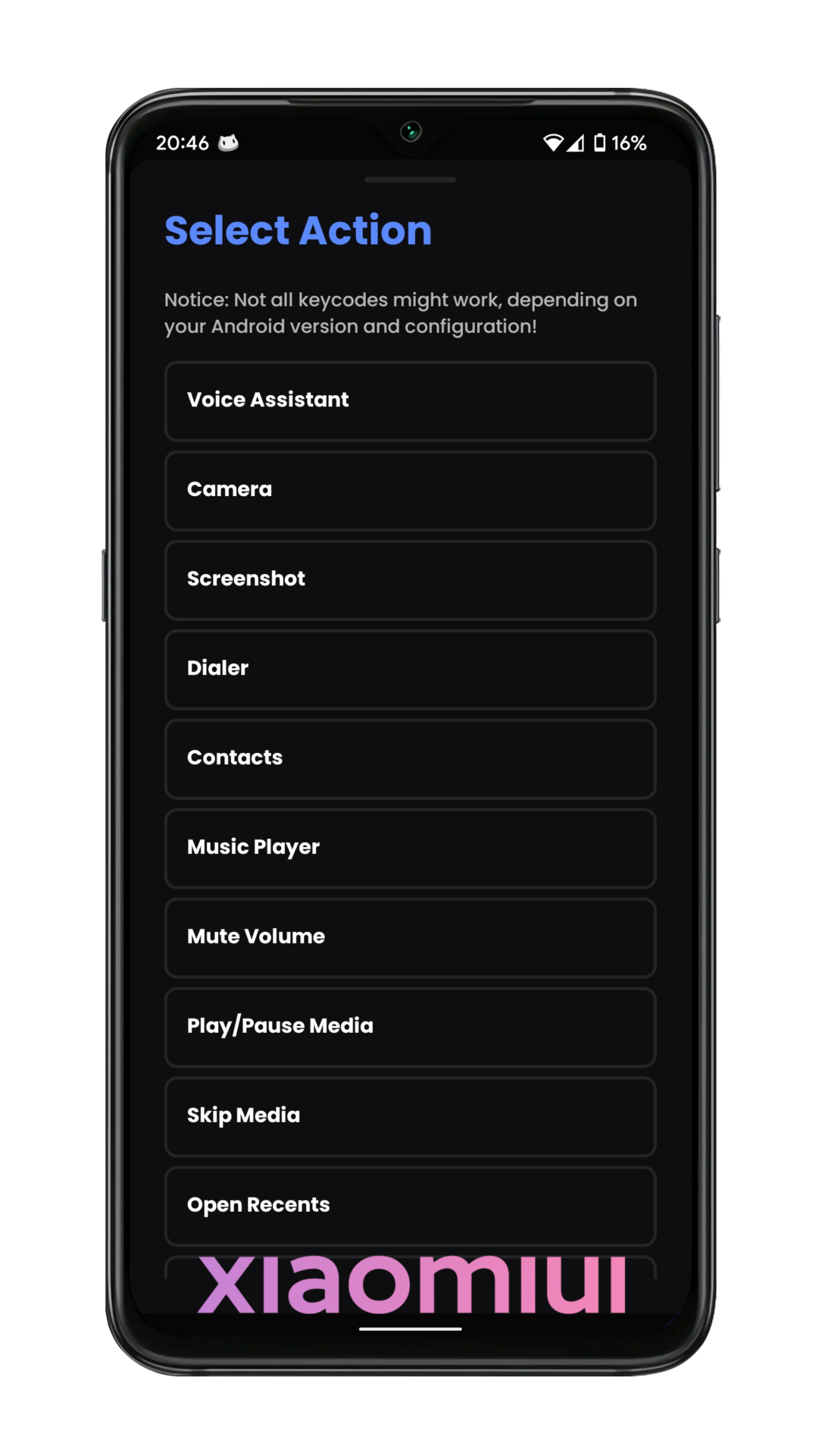 After that you will see settable actions. With this you can only do actions that are here. Select an action what do you want and reboot your device.
