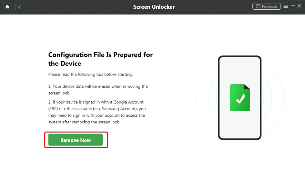 Step 3: DroidKit automatically detects your device and prepares necessary files. Proceed by clicking Remove Now.