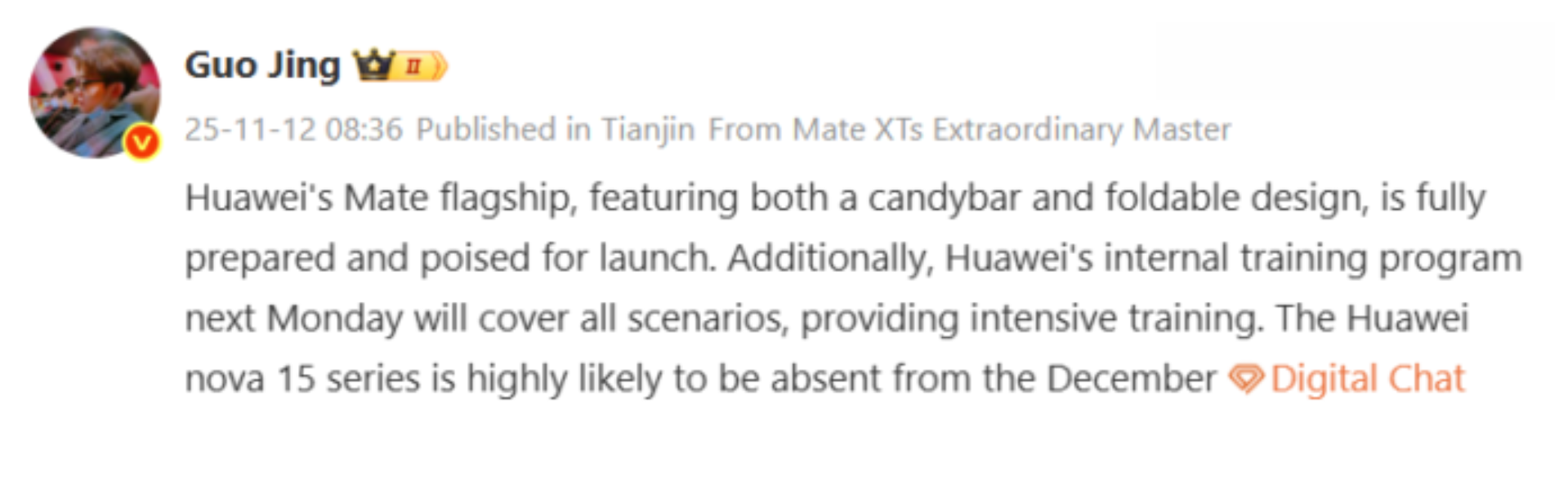 According to a Chinese leaker, the Huawei Nova 15 series will not be announced in December.