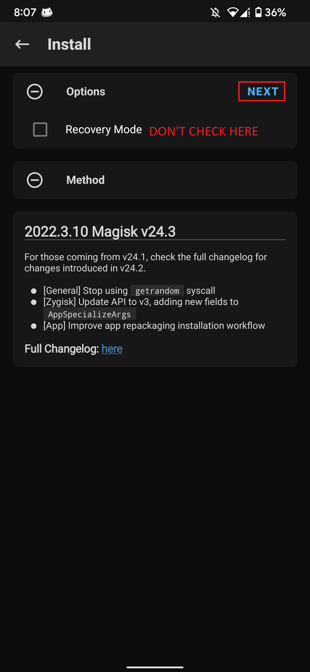 - Then you will see the updater screen. Please don’t check te “Recovery Mode” option. If you select this, your device may become brick and all your data may be deleted. tap “Next” button and select “Direct install” section. Then tap “LET’S GO” button for installing new version of Magisk.