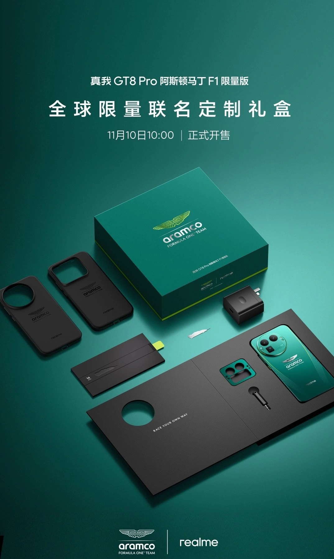 The special edition smartphone is set to hit the shelves on November 10 in China. The phone is the same Realme GT 8 Pro model we introduced a few days ago. However, the new variant sports the Aston Martin F1 design, including dual-wing aerodynamic curves and the Aston Martin logo.
