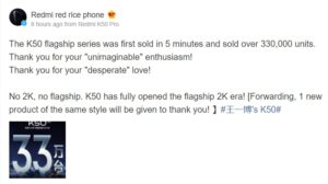 Redmi held a new product launch on March 17, unveiling the Redmi K50 series, the most powerful smartphone it has ever produced, among many other products. The Redmi K50 Standard Edition and Redmi K50 Pro started to sold in online stores on March 22 starting at 10:00 PM. Exactly 5 minutes after it went on sale, over 330.000 Redmi K50 Pro were sold.