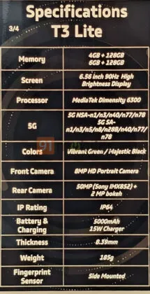 According to the leak, the Vivo T3 Lite will offer the following: