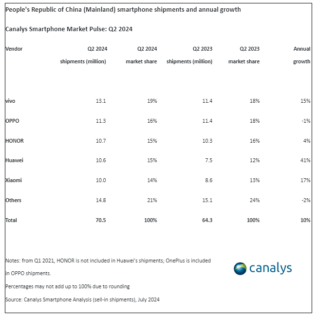 Compared to the sales Vivo made last year during the same quarter, Vivo reached 15% annual growth in Q2 2024. Canalys shared that the “strong performance in offline channels and robust online sales during the ‘618’ e-commerce festival” significantly contributed to this success.