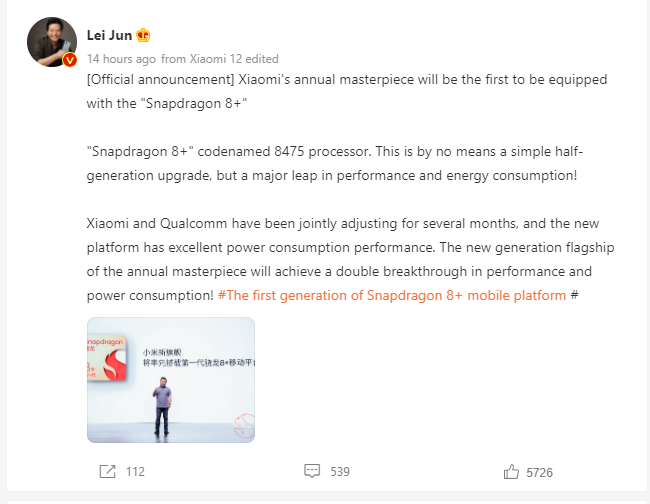 Xiaomi’s founder and CEO, Lei Jun, has made an official announcement about the company’s upcoming annual masterpiece on the Chinese microblogging platform Weibo. He has officially confirmed that the upcoming Xiaomi flagship will be the first device to be powered by the Snapdragon 8+. He went on to say that the Snapdragon 8+ was codenamed 8475. This is not a simple half-generation upgrade, but rather a significant improvement in performance and energy consumption.